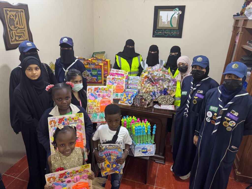 حيث قدم فريق سواعد الحي التطوعي الهدايا للأبناء ، وكذلك وفر فريق مرشدات مكة المكرمة الكشفي الهدايا المتنوعة والشكولاته والحلوى المختلفة.