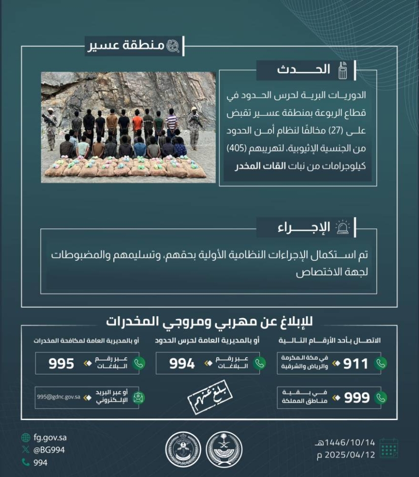 قبضت الدوريات البرية لحرس الحدود في قطاع الربوعة بمنطقة عسير على (27) مخالفًا لنظام أمن الحدود من الجنسية الإثيوبية، لتهريبهم (405) كيلوجرامات من نبات القات، وجرى استكمال الإجراءات النظامية الأولية بحقهم، وتسليمهم والمضبوطات لجهة الاختصاص.