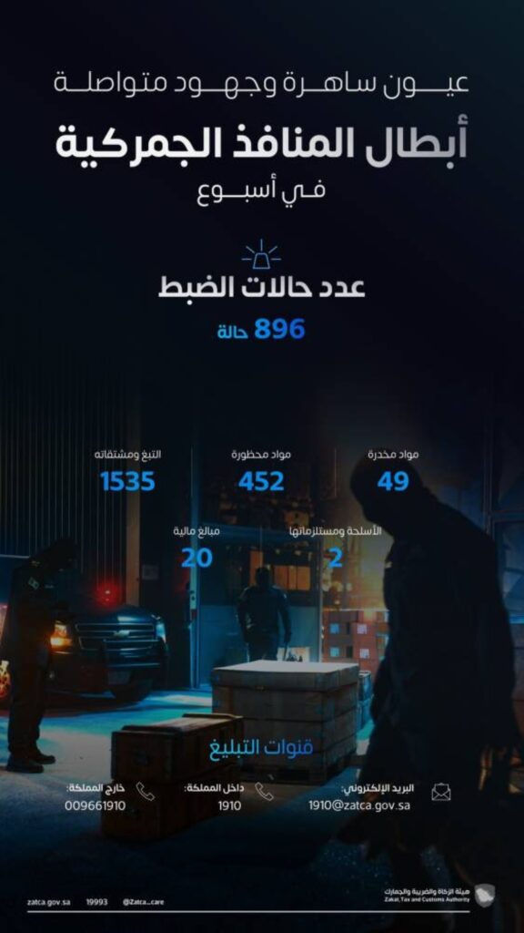 ودعت الهيئة في الوقت ذاته الجميع إلى الإسهام في مكافحة التهريب لحماية المجتمع والاقتصاد الوطني، من خلال التواصل معها على الرقم المخصص للبلاغات الأمنية (1910) أو عبر البريد الإلكتروني (1910zatca.gov.sa) أو الرقم الدولي (009661910).